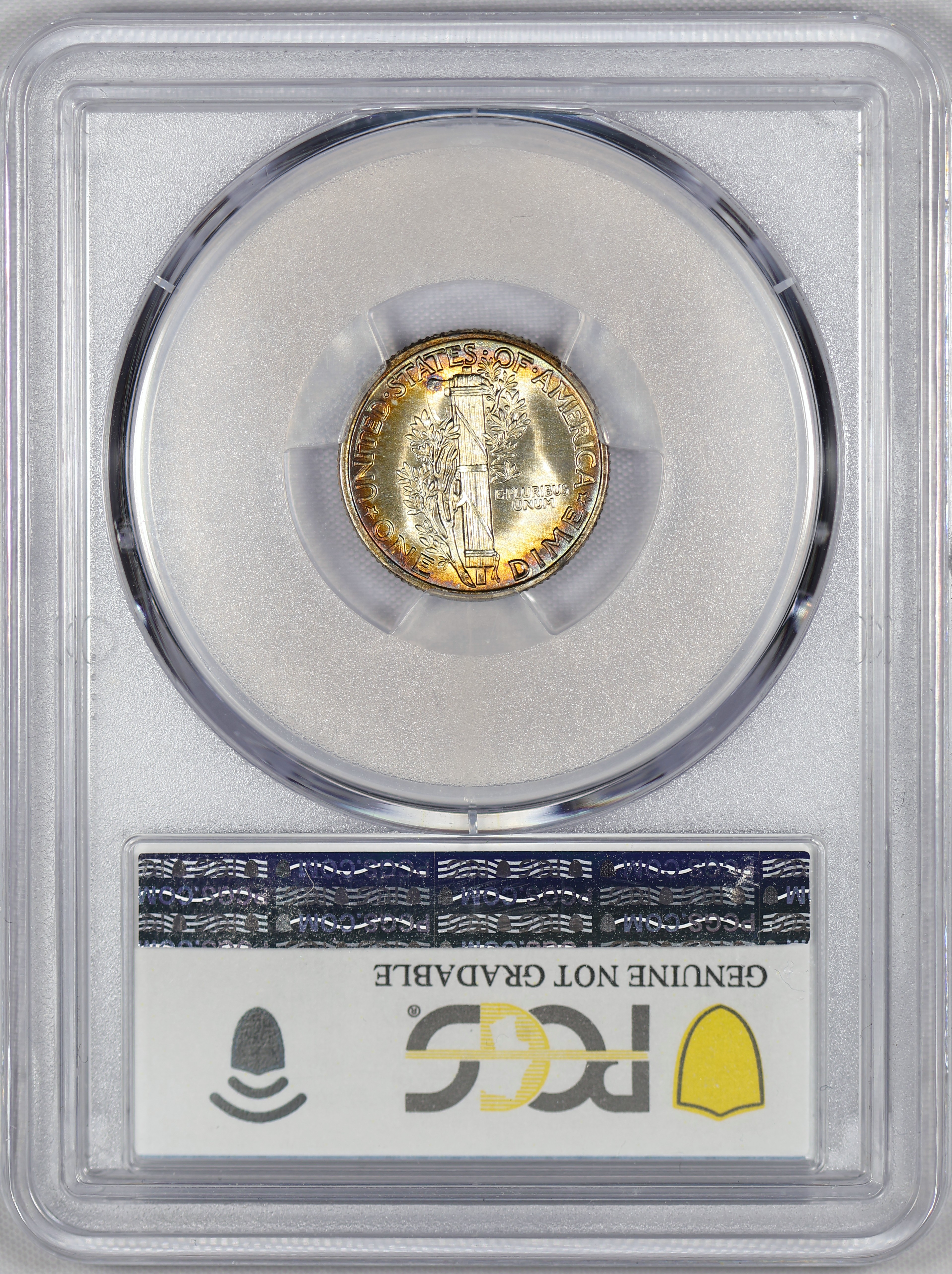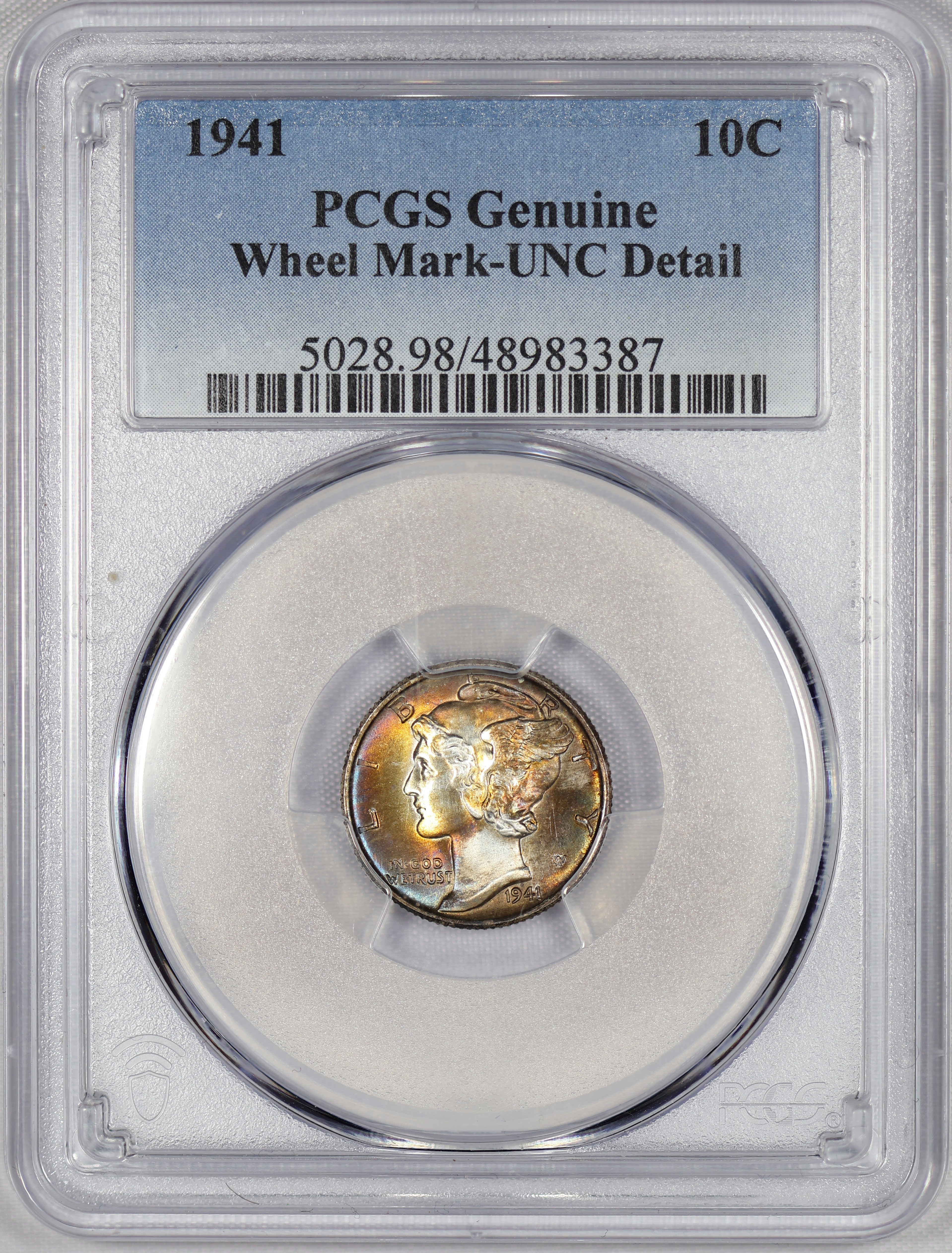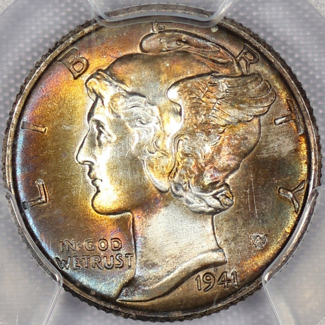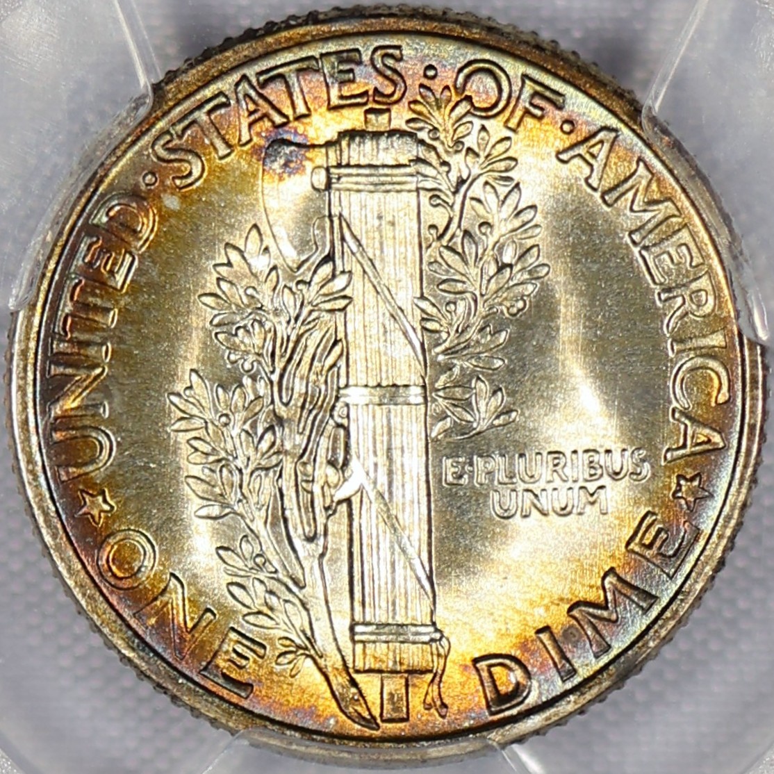 (#E7E48) If this was not details it would likely be in the 67 range with FSB. Not to mention some of the best toning a Mercury Dime can offer!