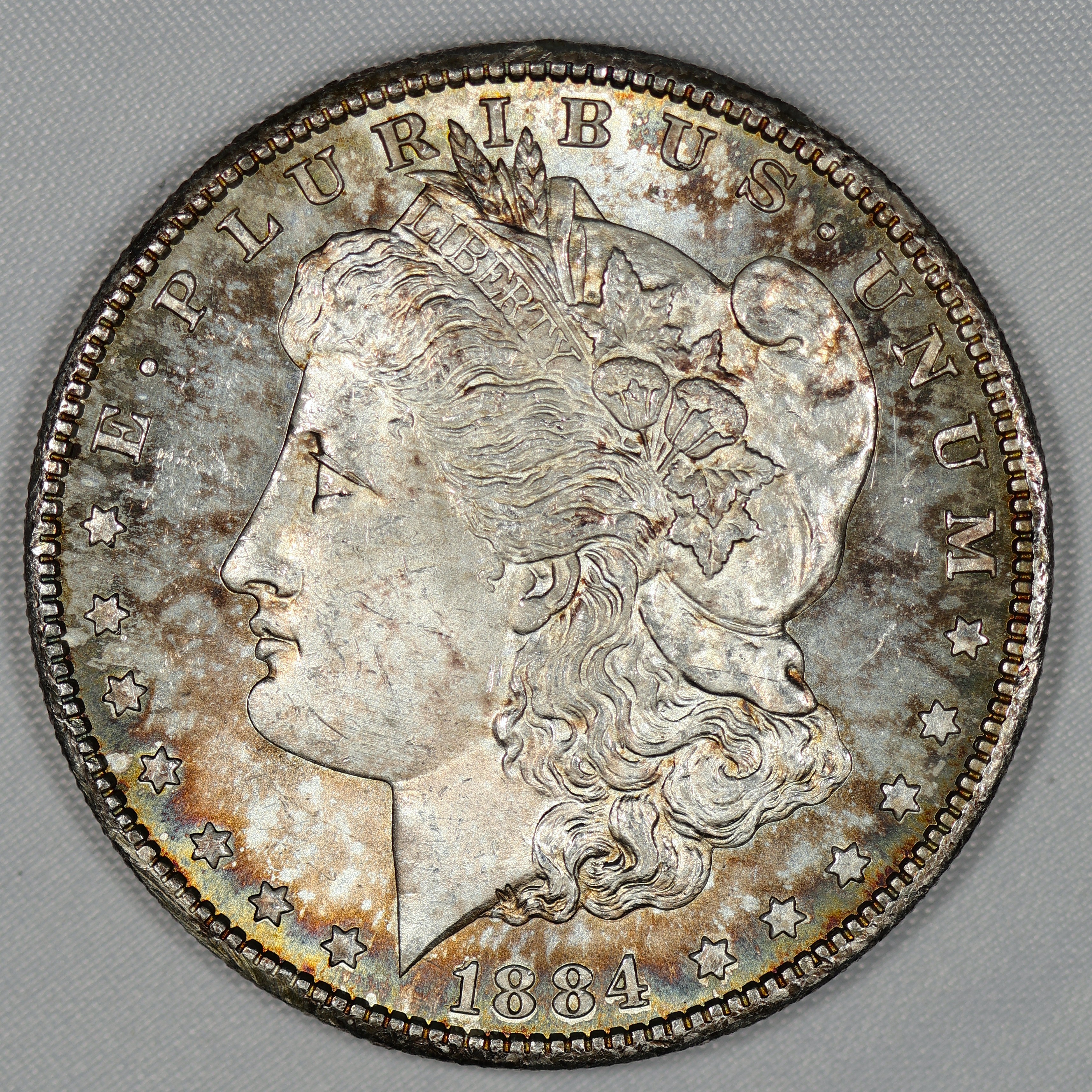 (#KZGQ) Auction Highlight: Another RARE find in this estate collection. A proof like strike with mirror fields, and frosted devices shining through a rainbow bouquet of color.