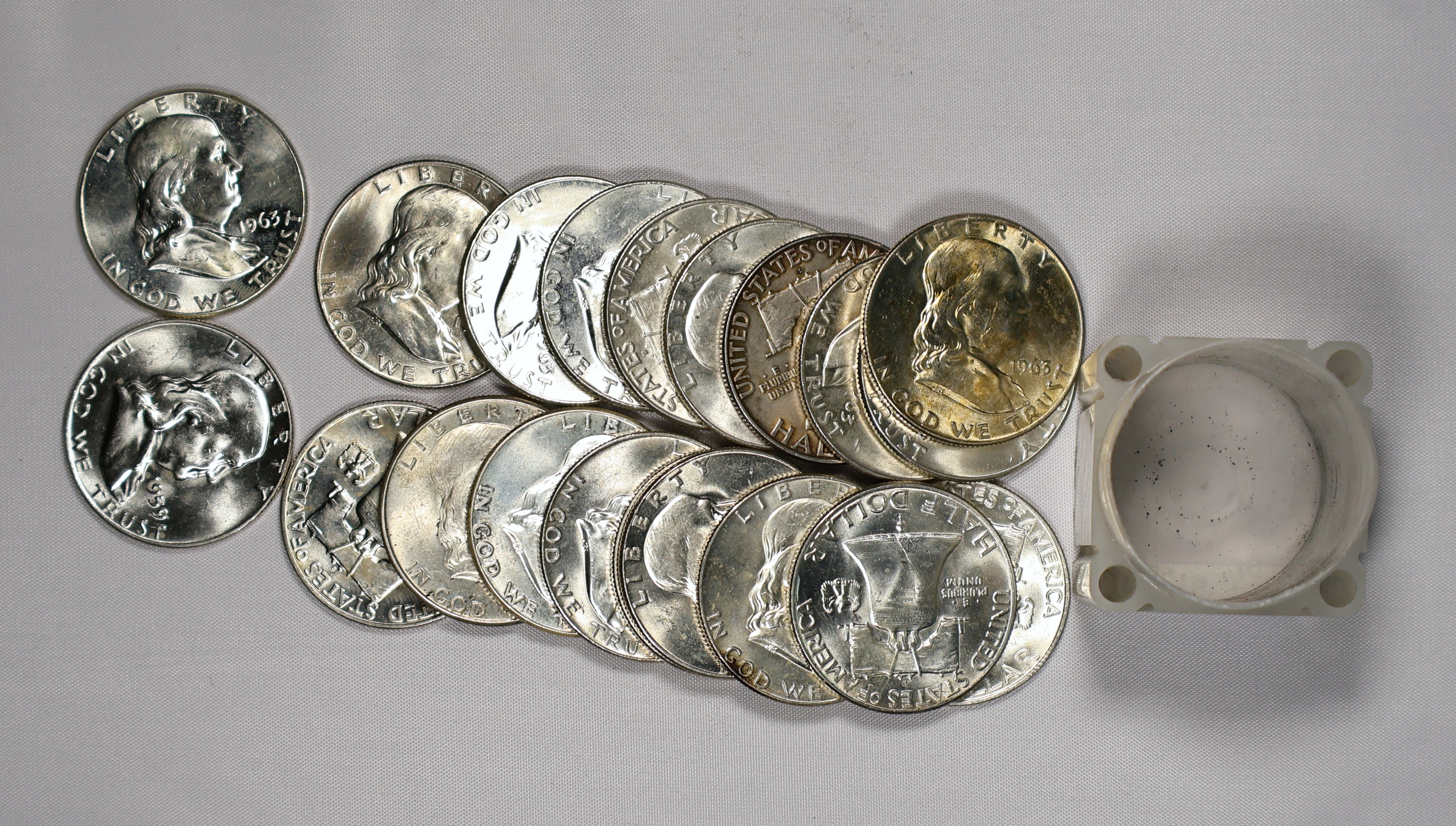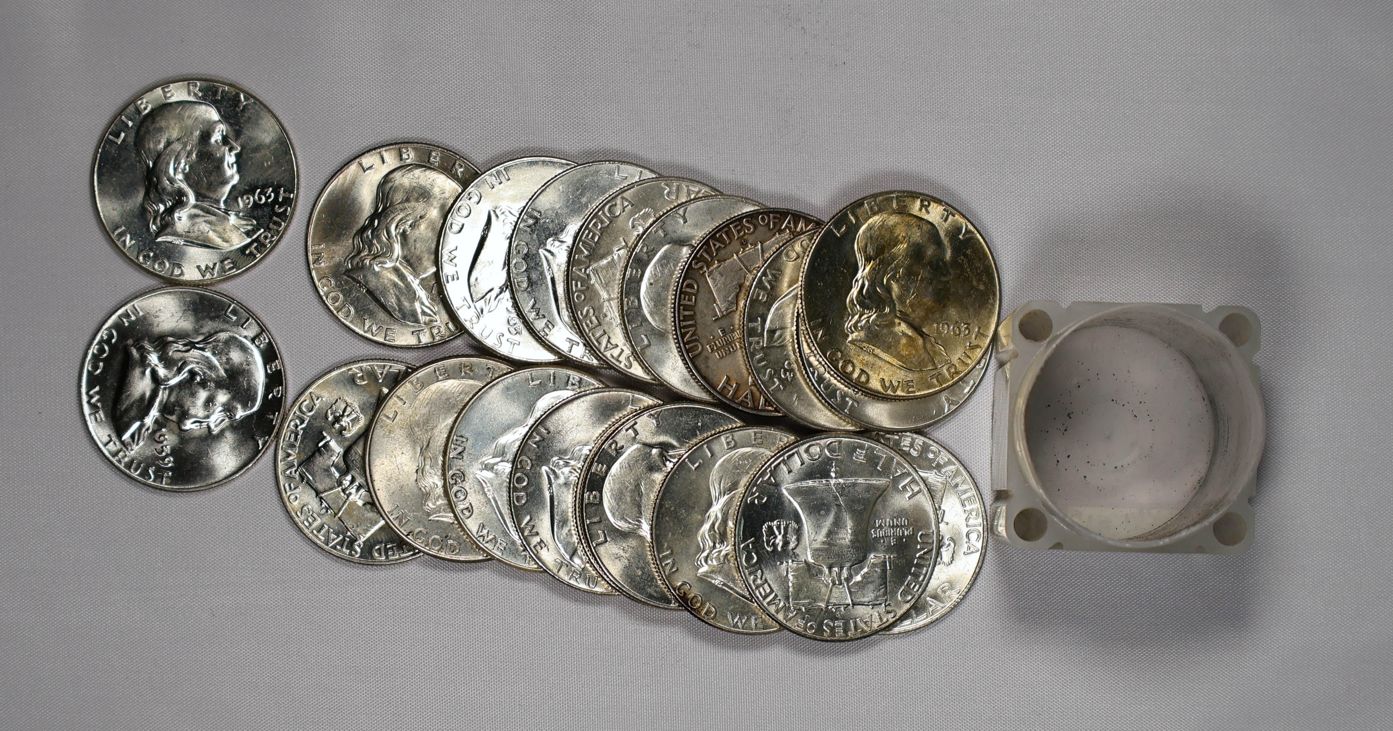 (#LJIL) Auction Highlight: One of three uncirculated mixed-date Franklin Half dollar rolls featured in this month’s auction.
