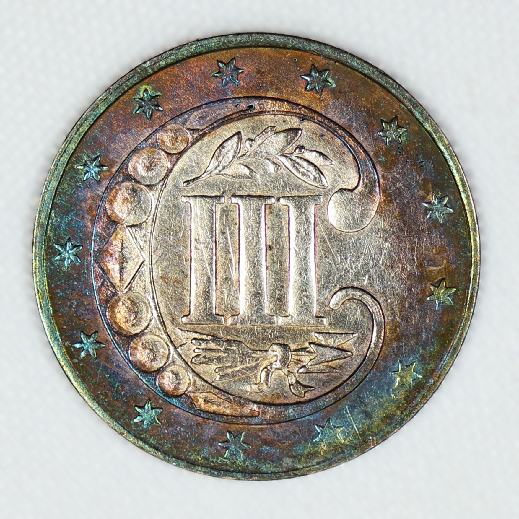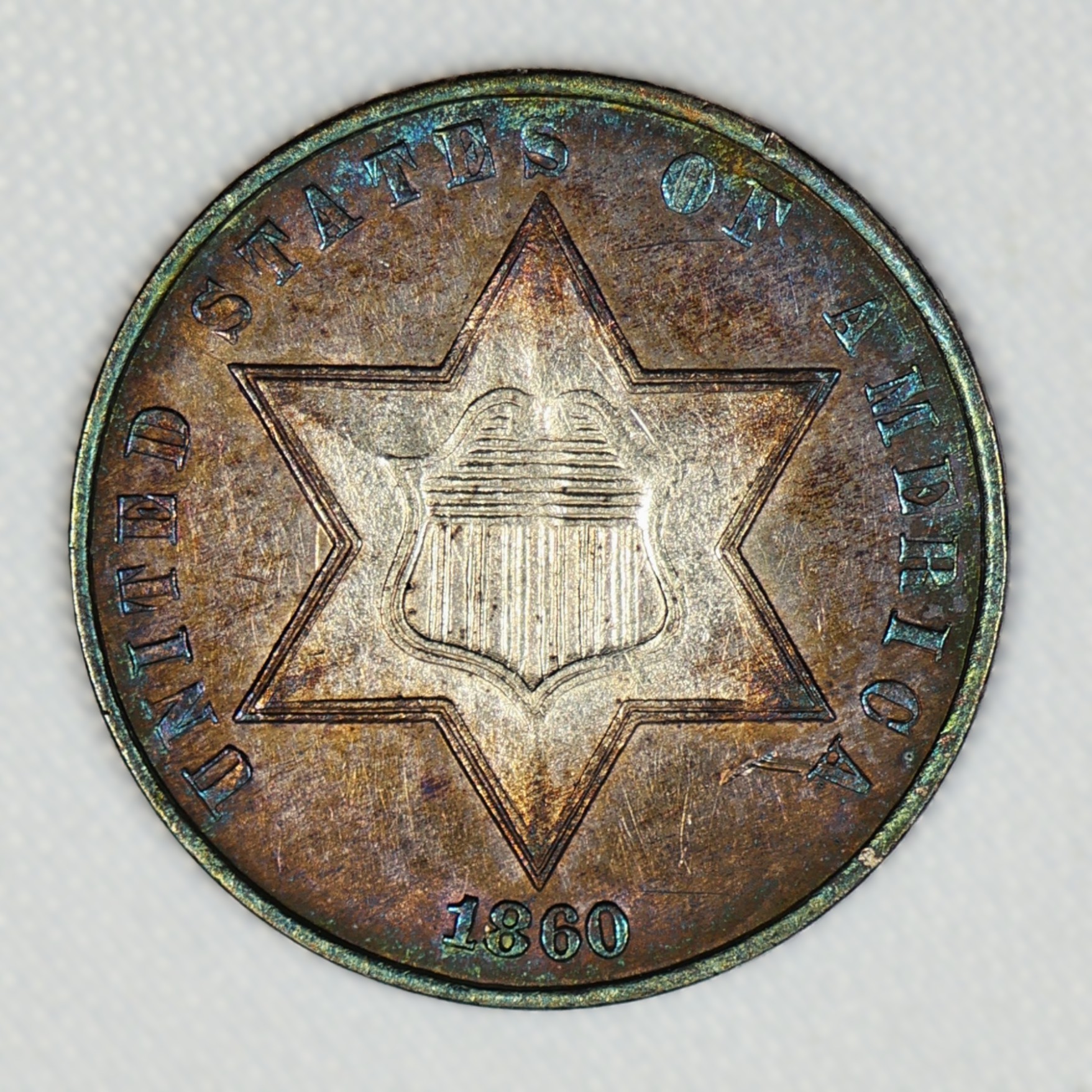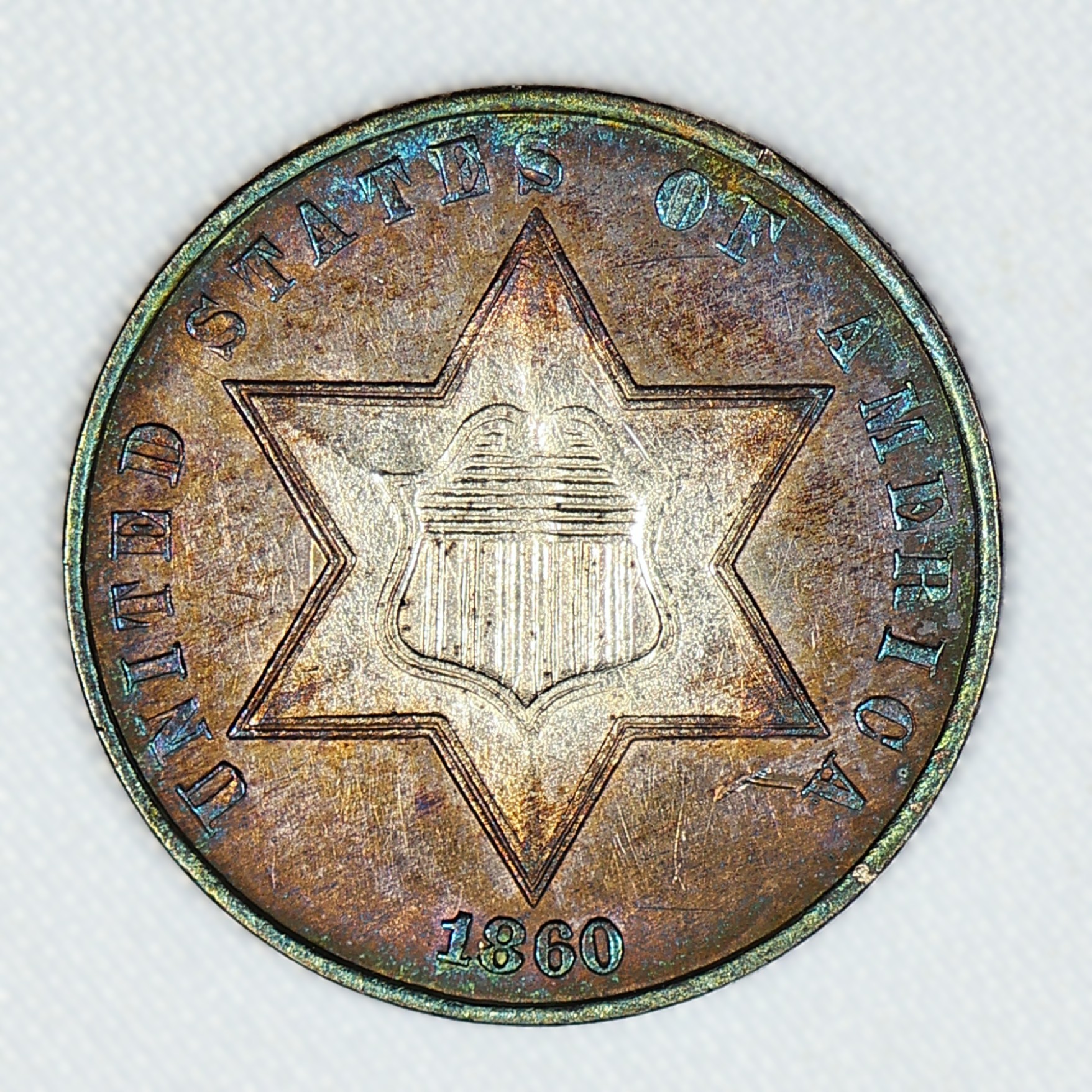 (#RZPS) Auction Highlight: A spectacular example of how the Three Cent Silver series can tone. The devices are frosted while the fields and rim feature iridescent-tropical blue green toning.