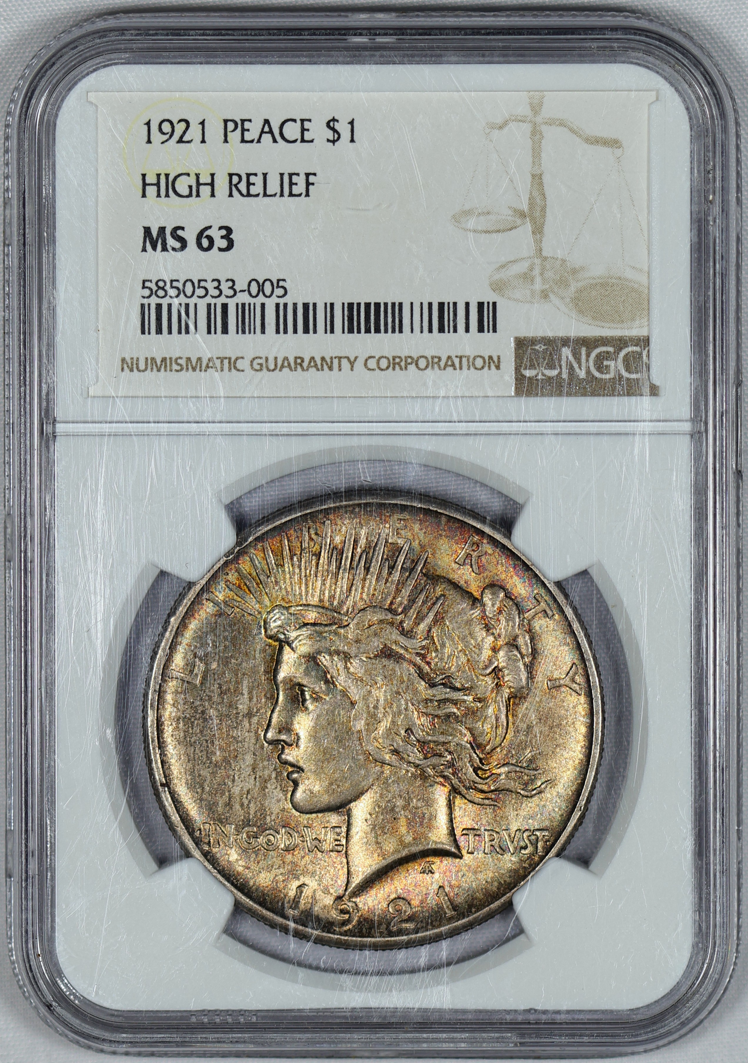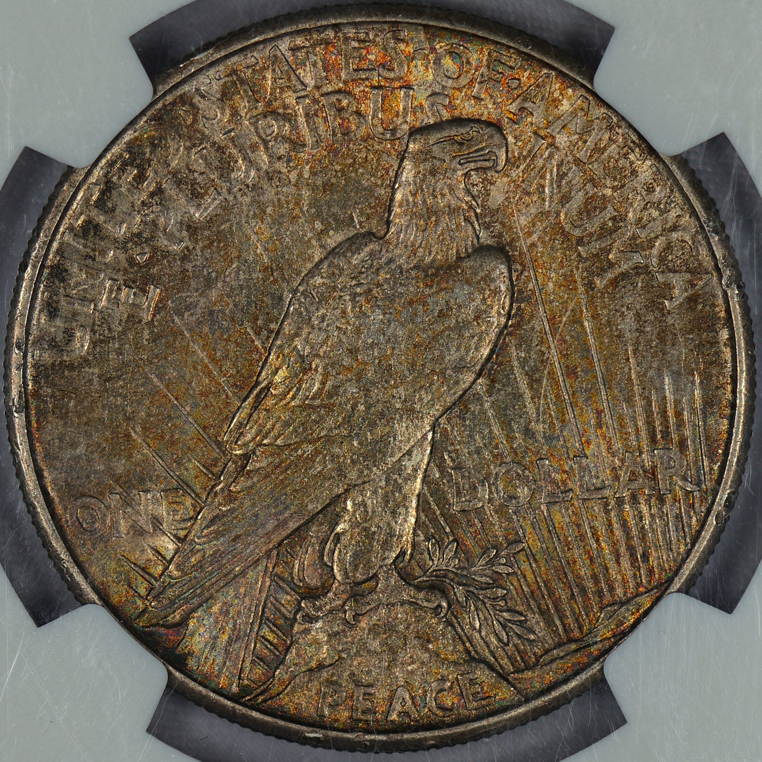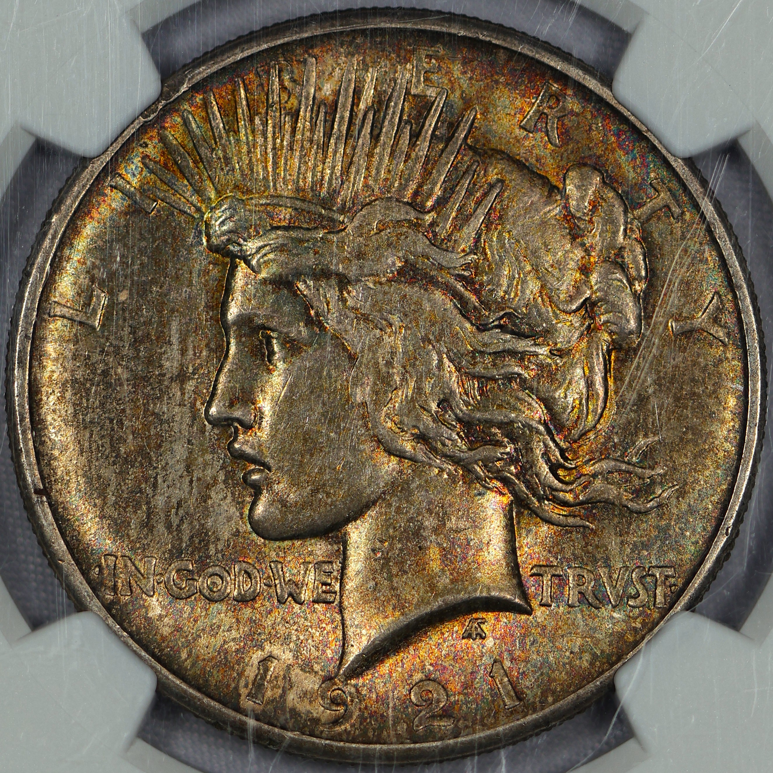 (#OXPI) Auction Highlight: 1921 is the first year of issue for the Peace Dollar series. This piece features a strong strike, clean fields, HIGH luster and stunning toning. It is extremely RARE to find nicely toned Peace Dollars in any year. Even more RARE are the prominent pinks and blues speckled throughout the obverse and reverse. The slab has scuffs and scratches. Reholdering this gorgeous coin will bring out the spectacular details.