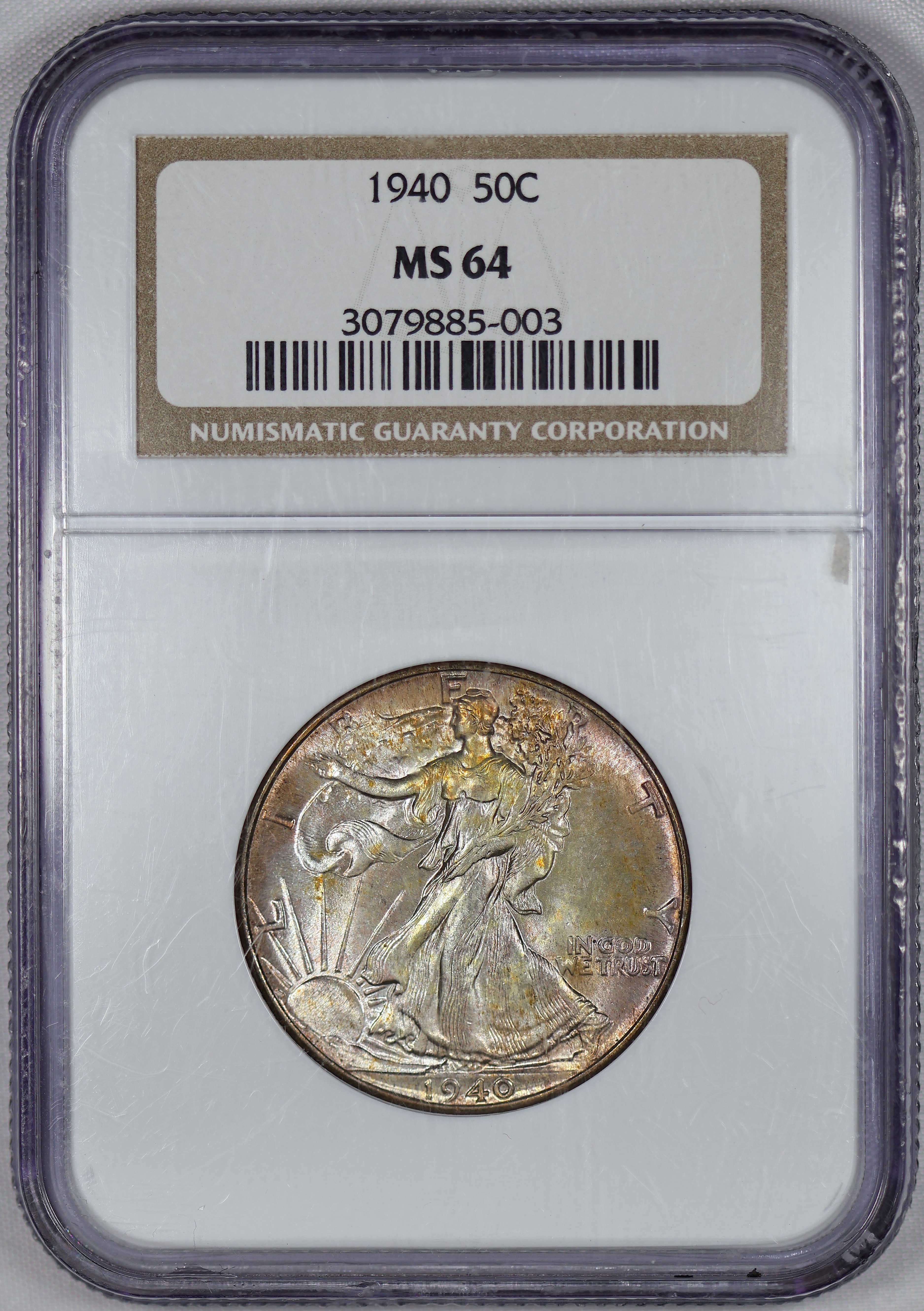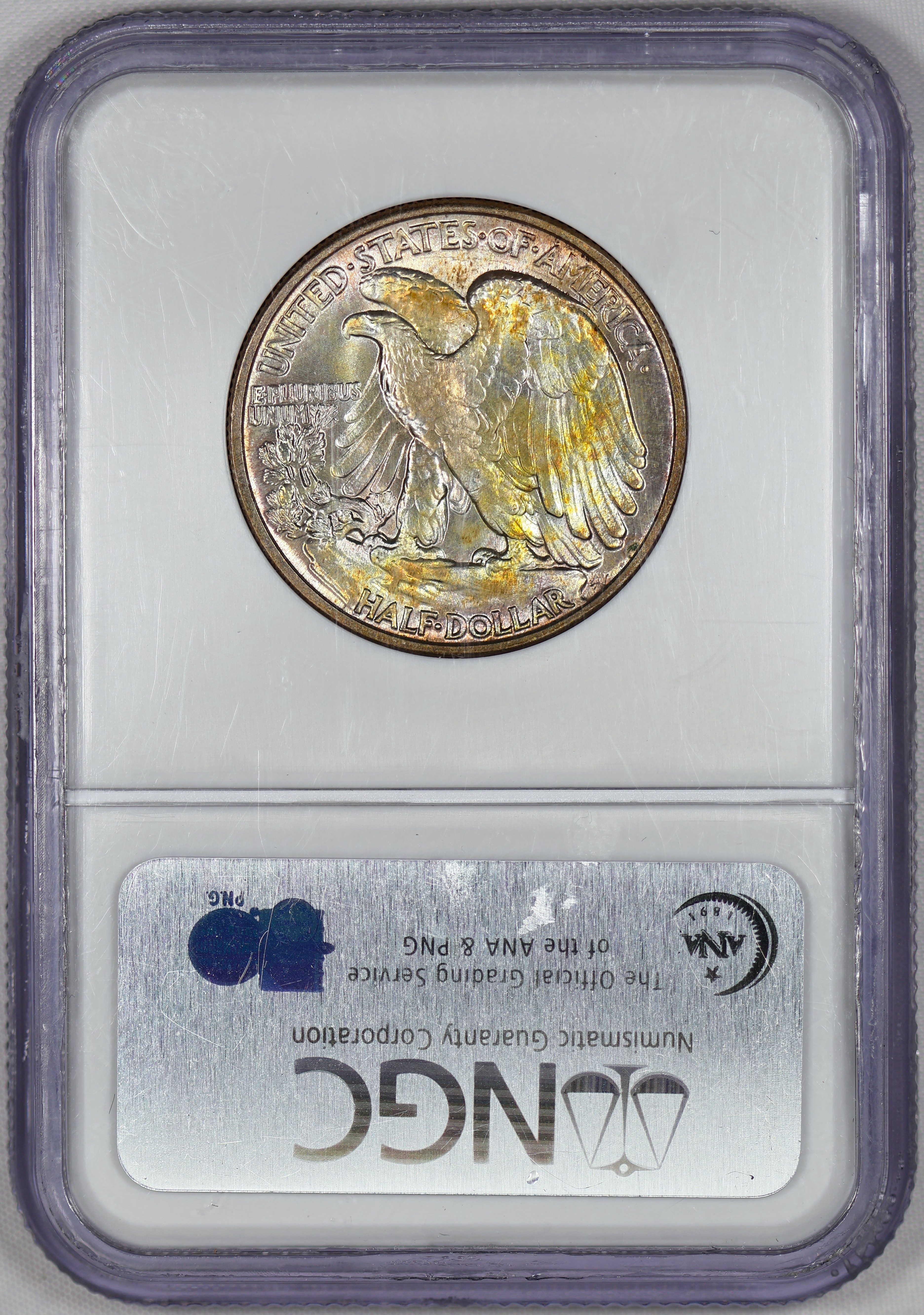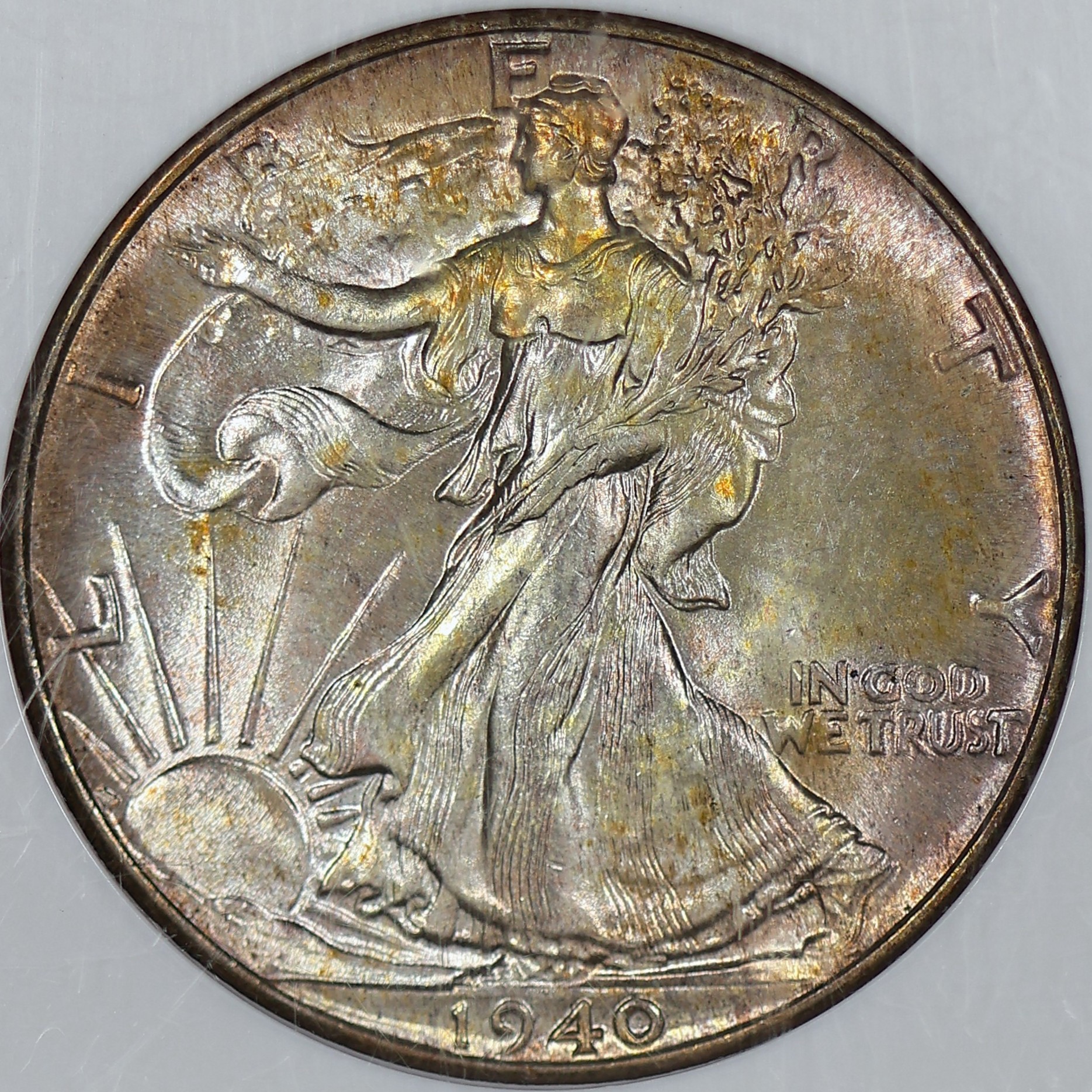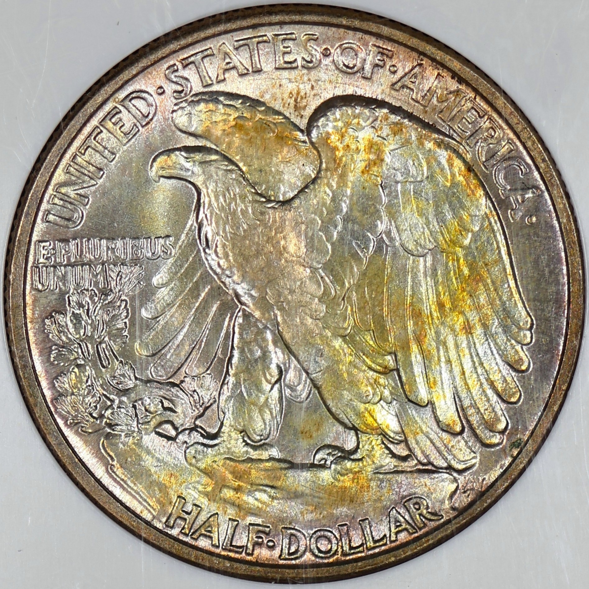 (#G5B75) It’s difficult to find nicely toned examples of Walking Halves. This coin’s toning stands out when you rotate it in the light giving a gold/red crystal-like appearance. Especially on the wings of the reverse.