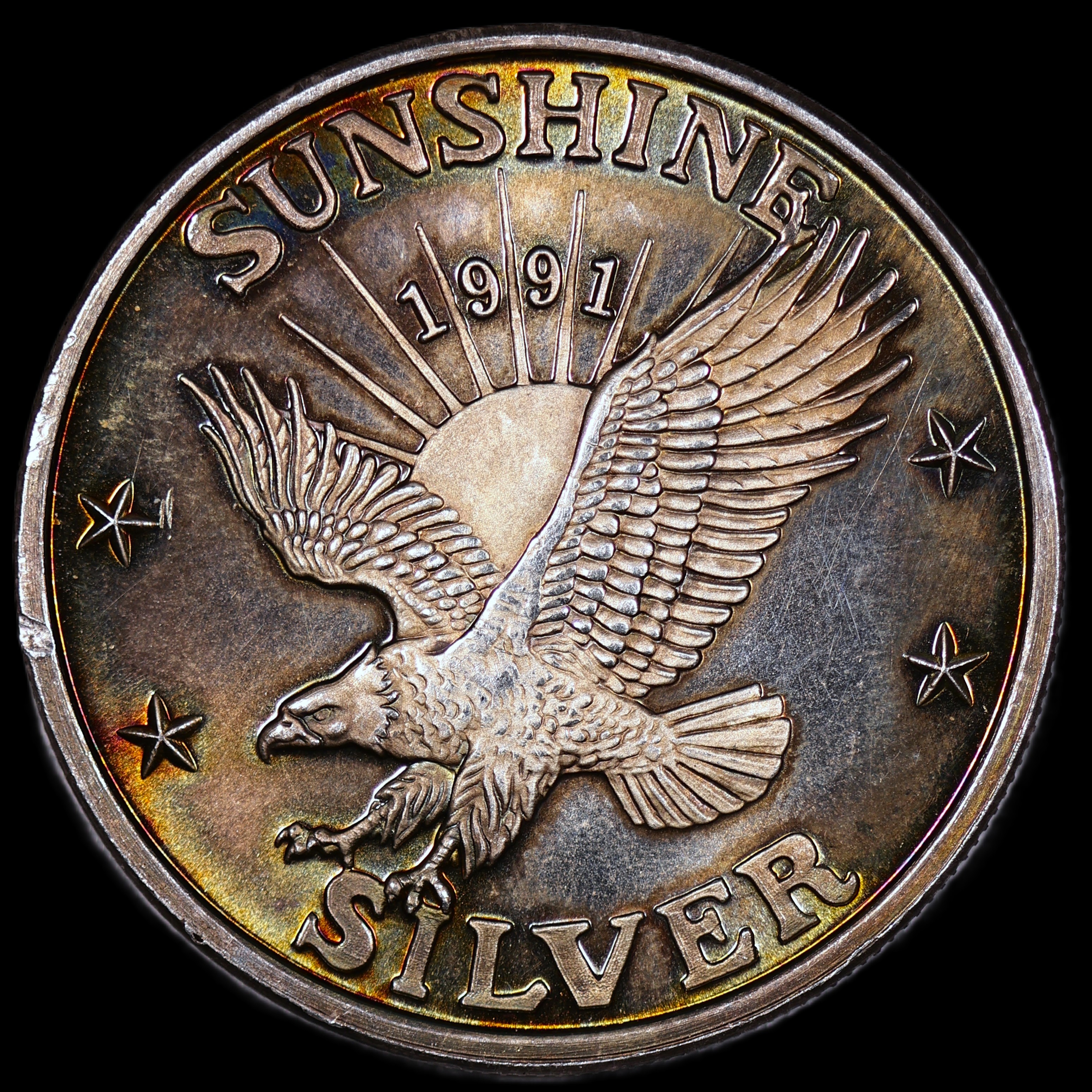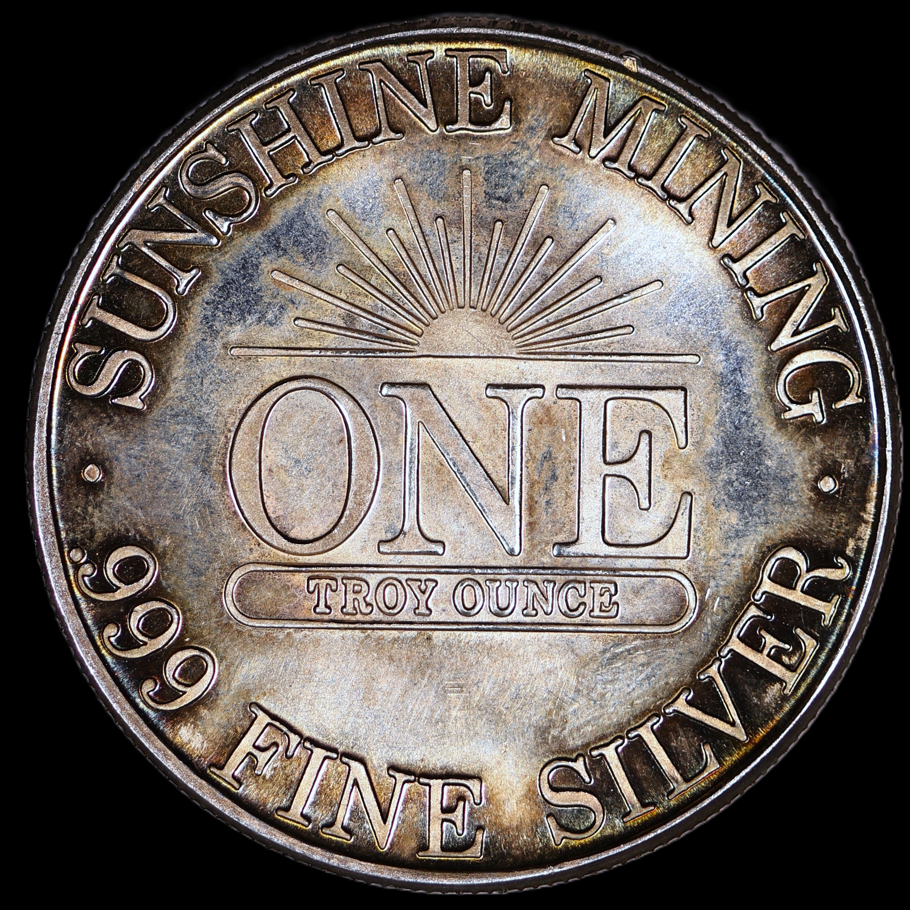 Beautiful natural rainbow toning on this vintage proof round!