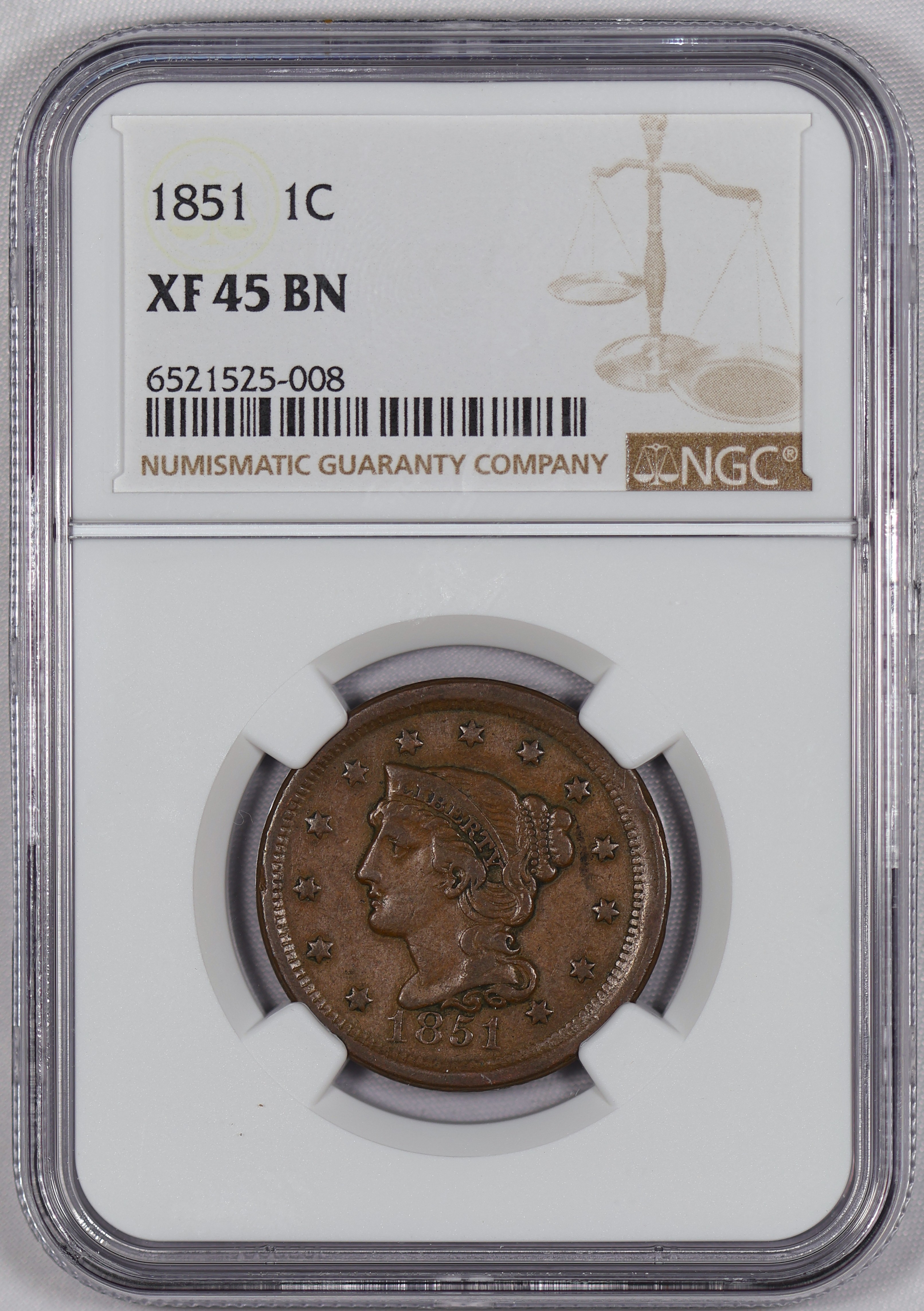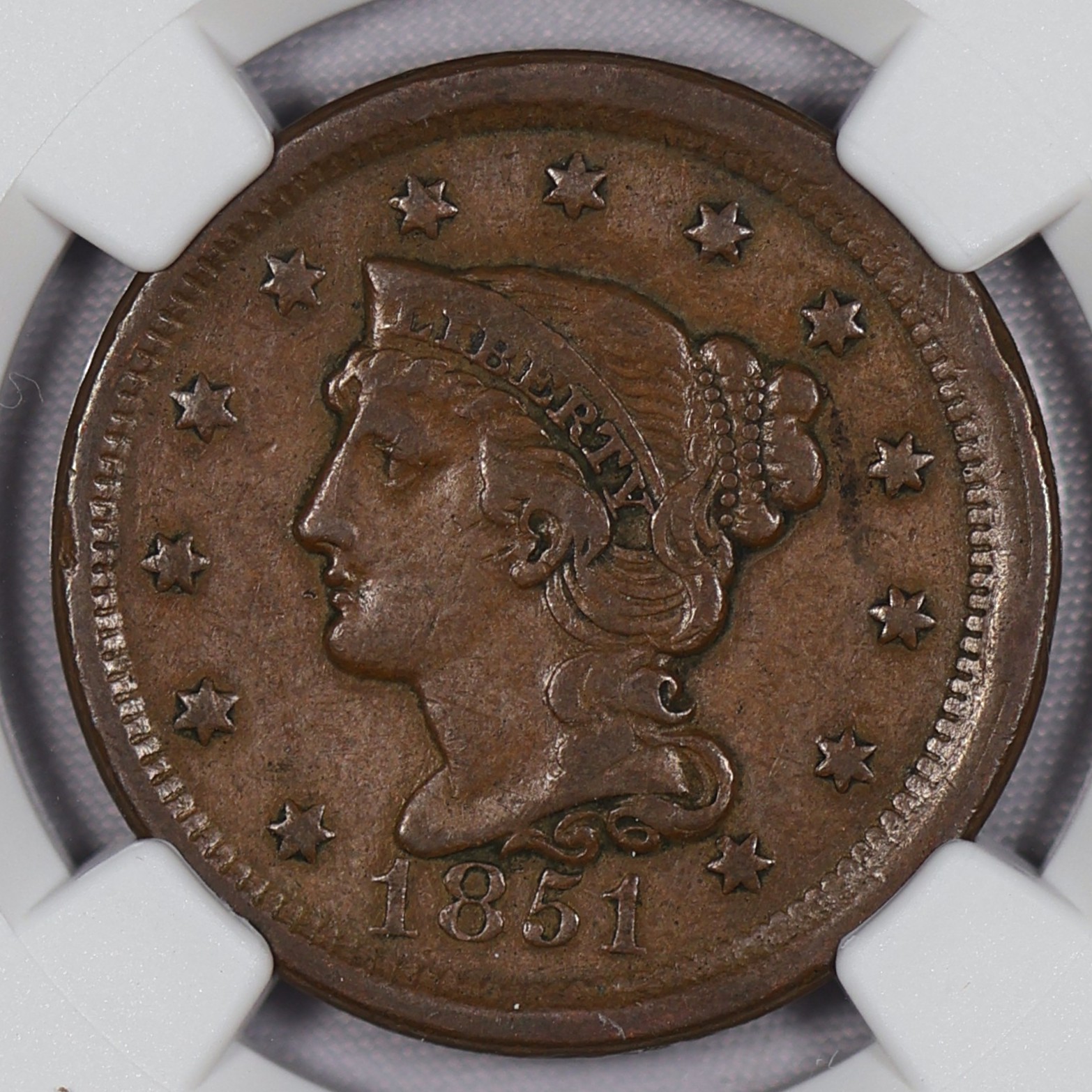 1851 Braided Hair Large Cent XF 45 BN NGC